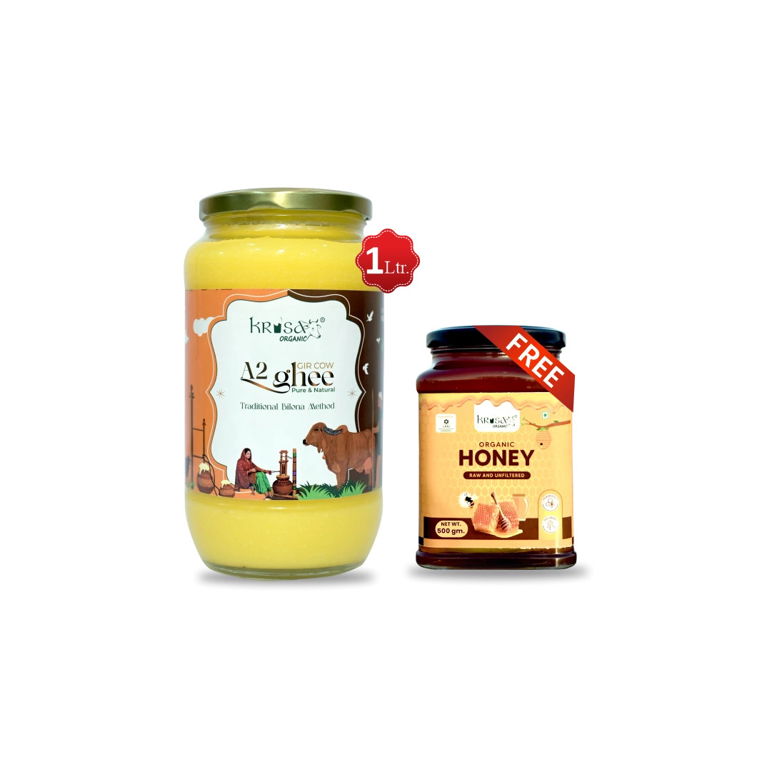 Enjoy wholesome nutrition and authentic flavour with the A2 Desi Cow Ghee & Honey Combo from Krisa Farm — a premium duo crafted for everyday health, traditional cooking, and pure goodness.
