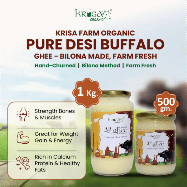 Experience the richness of traditional Indian nutrition with Homemade A2 Desi Buffalo Ghee from Krisa Organic – the best ghee brand known for purity and quality. Our ghee is made using the a2 buffalo bilona ghee method, crafted in small batches using pure buffalo milk sourced from free-grazing A2 Gir buffaloes. This ensures you get the purest buffalo ghee, rich in flavour, nutrients, and health benefits.