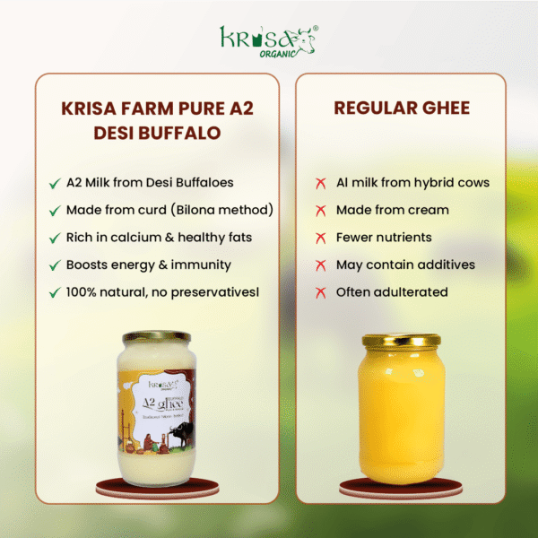 Whether you’re looking to buy desi buffalo ghee online or searching for the best A2 buffalo ghee at a good price, Krisa Organic delivers on all fronts. Our buffalo ghee 1kg price is competitive while maintaining top-tier quality. If you’re checking the pure desi buffalo ghee price, we promise genuine value for every rupee.