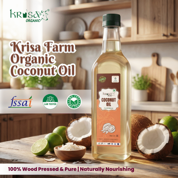 Cooks and health practitioners commonly use coconut oil in Indian cuisine and health practices, and they value it for its light consistency, stability, and versatility in both cooking and personal care. Krisa Organic, therefore, prioritizes a slow and gentle extraction method using wooden ghani in order to protect the coconut’s integrity; consequently, it avoids resorting to harsh refining techniques.