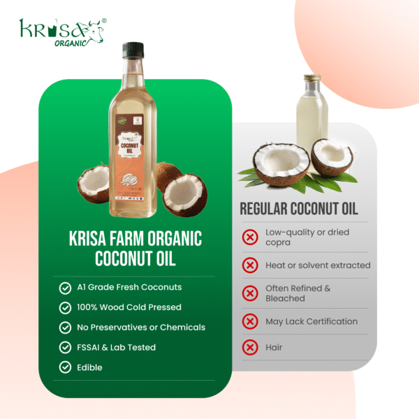 Known for its versatility, families use it in cooking and personal care routines due to its moisturizing properties for hair, skin, and massages. Krisa Organic, therefore, produces this oil with a focus on maintaining its versatility.