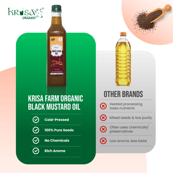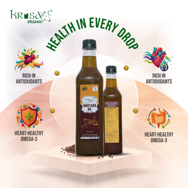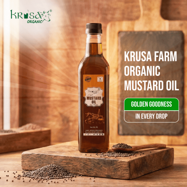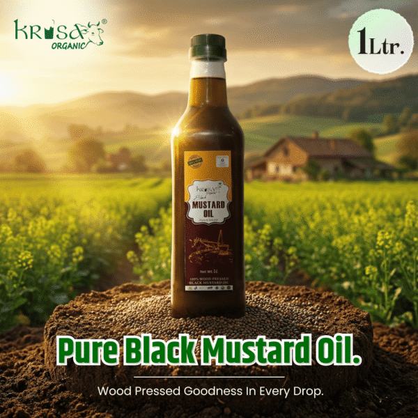 Krisa Organic Foods, our black mustard oil is Wood Pressed to preserve its pungent flavor and nutritional value. Known for its distinct aroma, it’s perfect for traditional Indian cooking, pickles, and is also widely used for massages and hair care.